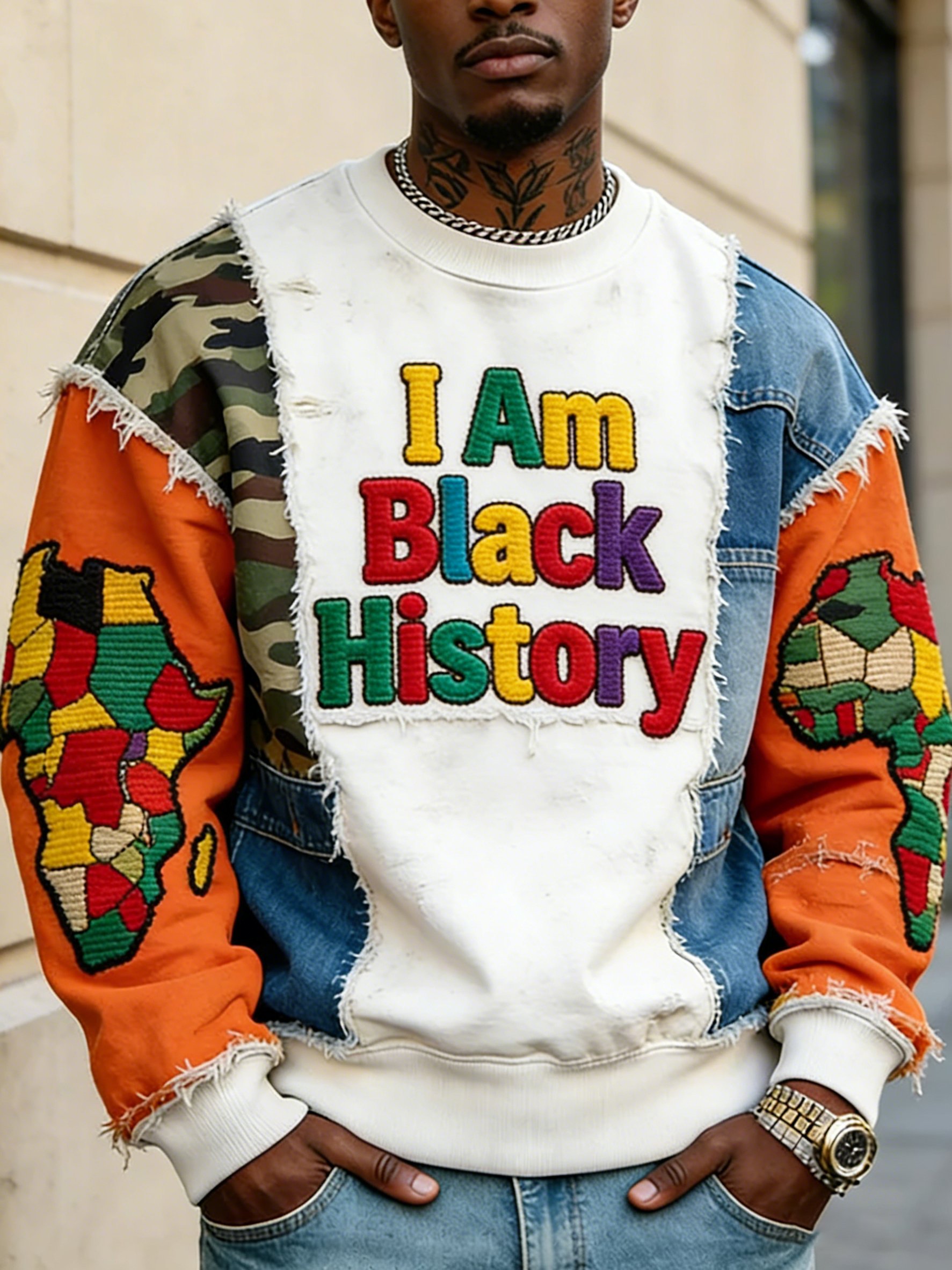 Men's casual sweatshirt with African-inspired pattern and patchwork design, and a round neckline.