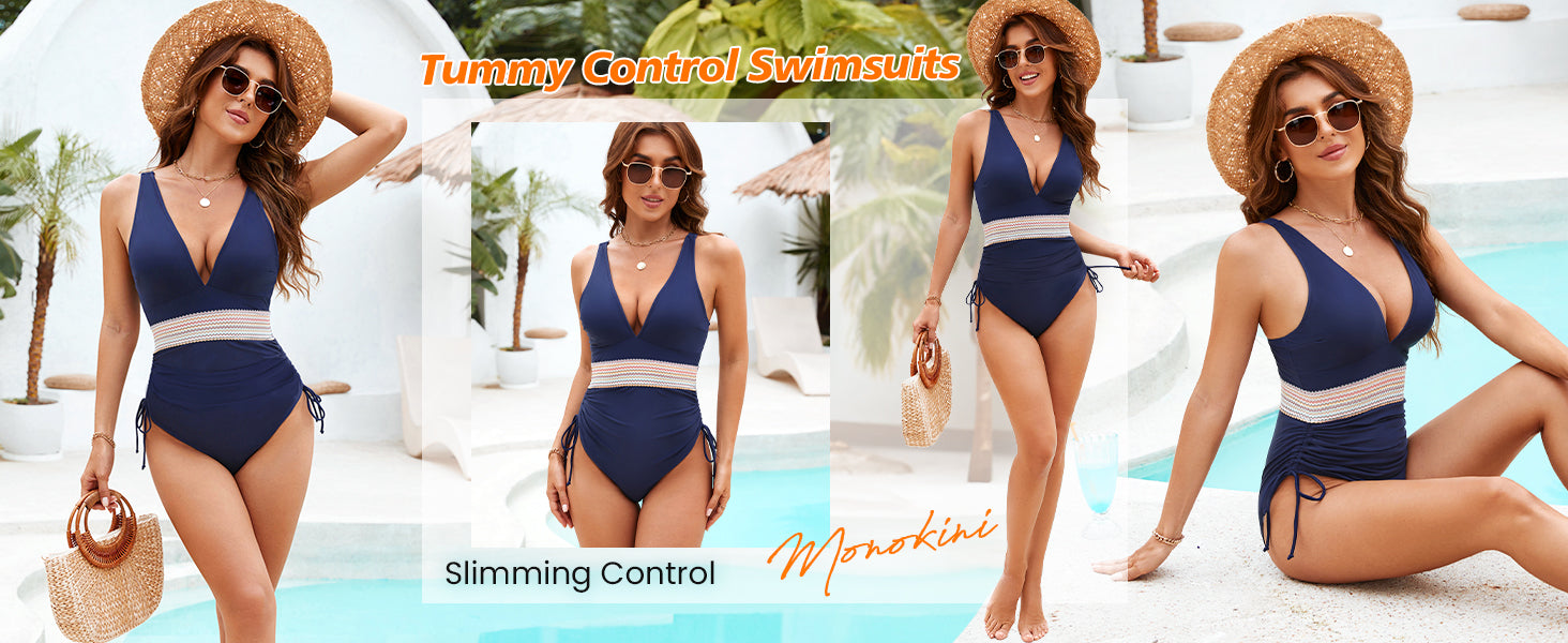 Women Tummy Control Swimsuits One Piece Slimming Modest Bathing Suit Color Block Drawstring Swim Suits