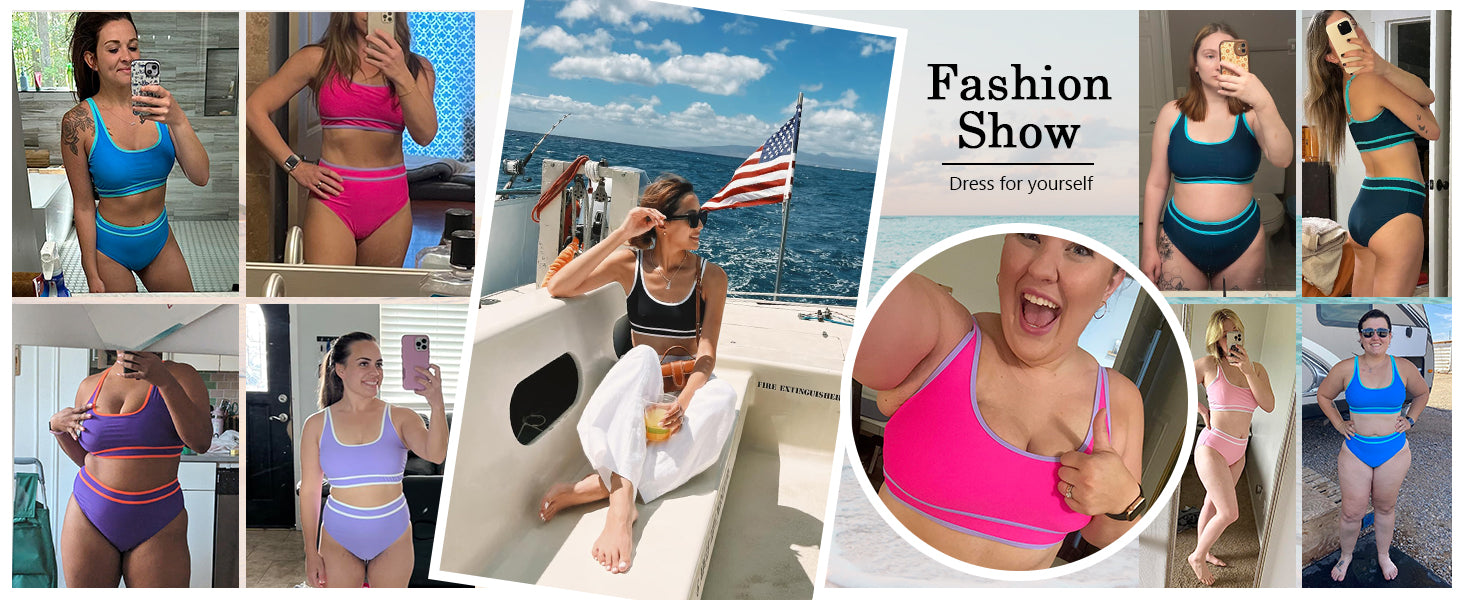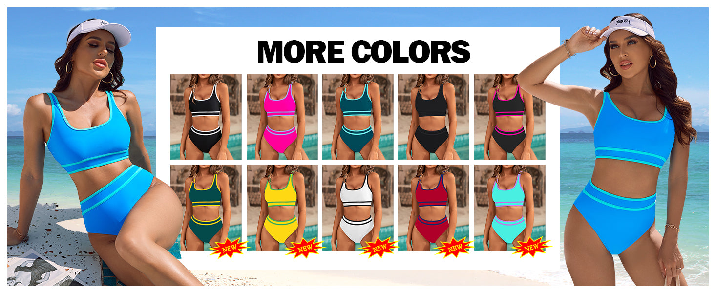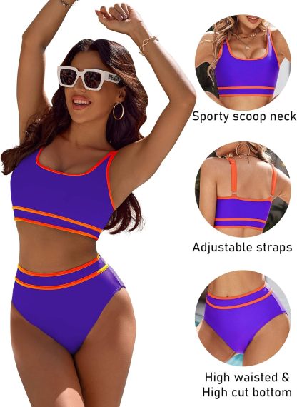 Women's High Waisted Bikini Sets Sporty Two Piece Swimsuits Color Block Cheeky High Cut Bathing Suits