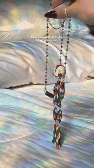 Every puppet I make is totally one of a kind! Each one is sculpted by hand with polymer clay, painted with acrylics, and sealed with a glossy water-based varnish to keep the colors bright and shiny. The puppets are attached to their control bars with a multicolored beaded chain to add some extra sparkle. The puppet in the picture is the one you will receive!
