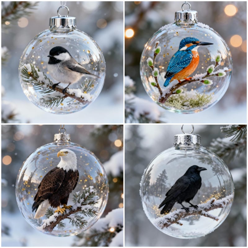 🕊️ Within crystal-clear glass spheres, nature’s beauty comes alive through four lifelike birds. The bald eagle stands proud with courage and strength, the kingfisher glows in blue and orange hues of calm renewal, the chickadee brings warmth and joy to the winter air, and the raven, quiet and wise, embodies mystery and remembrance. Together, they shimmer softly under festive lights, capturing the timeless spirit of the season.