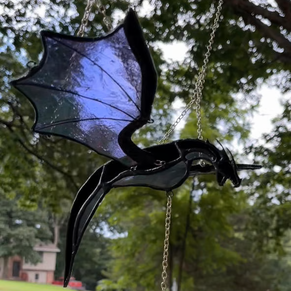 Bring fantasy to life with this handcrafted Stained Glass Dragon Ornament, designed to gently flap its wings up and down with the breeze. Whether you hang it by a sunny window, on a porch, or in your garden, this magical creature will mesmerize you with every flutter. 💫