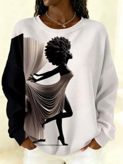 Women's Black Girl Art Print Knitted Round Neck Long Sleeve Top